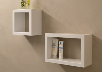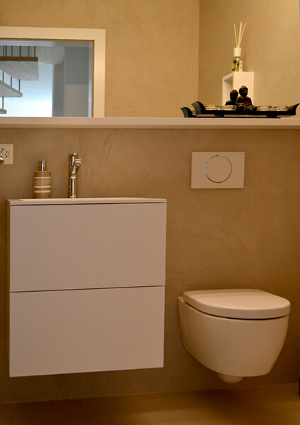 Badmöbel mit Acryl-Abdeckung. Dazu offene Wandmöbel, verdeckt montiert und in der gleichen Farbe lackiert.