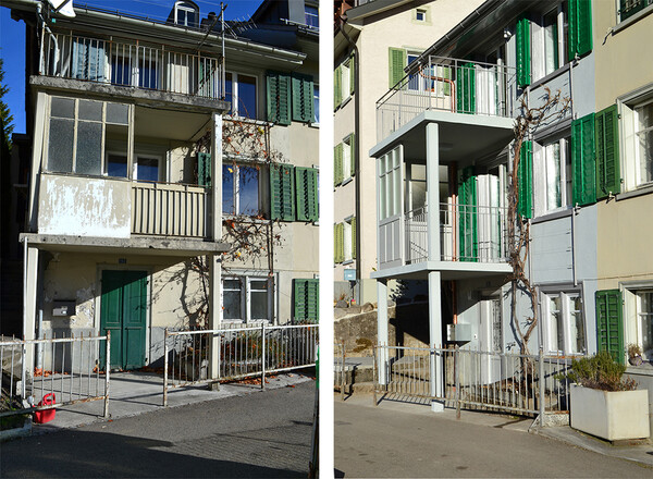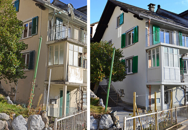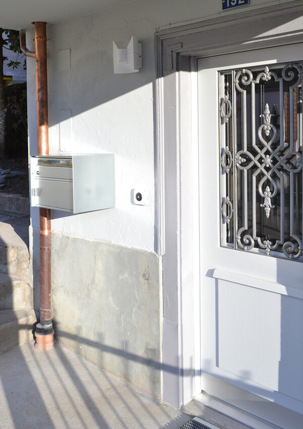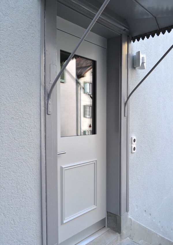 Gestemmte Aussentüre mit neu patiniertem Metallgitter.