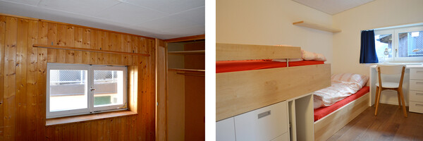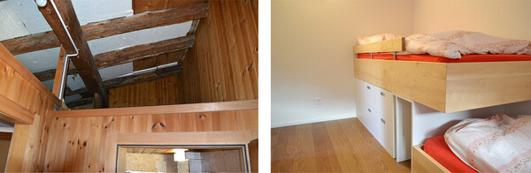 Perfekte Platzausnützung durch die verschachtelten Betten und den integrierten Schubladen darunter. Der helle Parkettboden und die weiss lackierte Täferdecke runden den gemütlichen Raum ab.