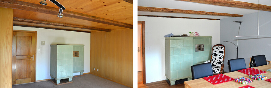 Mit der Aufhellung durch weisse und graue Wände statt Holzverschalung wirkt der Raum eindeutig grösser. Die Altbalken wurden restauriert. Der Kachelofen wurde gründlich gereinigt und als Stilelement belassen. |