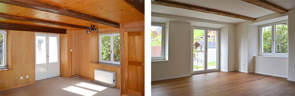 Unten dem neuen Holzboden (Eiche caramel) wurde eine Bodenheizung verlegt, die Fenster durch moderne Holz/Alu-Modelle ersetzt. Der Charme der Stube blieb so erhalten, der Komfort dem heutigen Standard angepasst. |